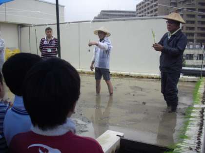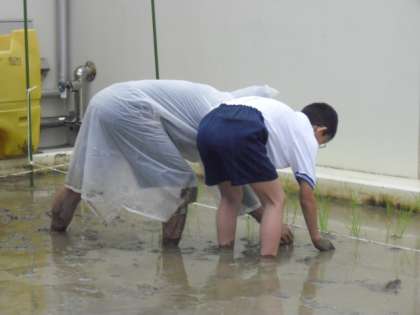 雨の中、5年生が屋上田んぼで田植えを行いました。例年同様、学校運営委員会、上祖師谷郷土研究会、おやじの会OBの皆様にご協力いただきました。