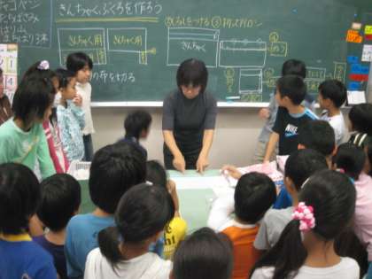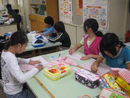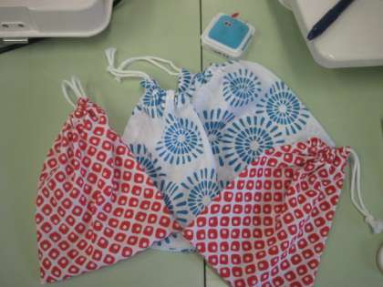 通力教諭は、学習発表会にむけて高学年の作品制作の真っ最中です。5年生は、2枚の手ぬぐいを使って、制作しています。今日は、巾着袋を作っていました。2時間で仕上げます。子どもたちは、手際よくやっていました。道具の扱い方に慣れ、素敵な作品のでき上がり!
