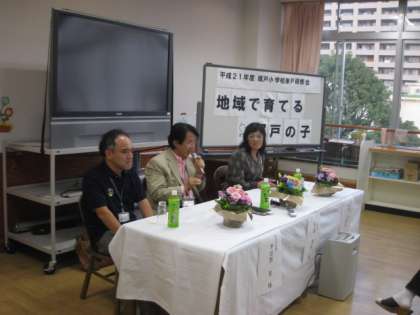 PTAの主催の研修会で、「地域で育てる塚戸の子」というテーマで、保護者・地域の方・教職員の3者が集いました。祖師谷児童館と粕谷児童館の方が、児童館での子どもたちの様子を話してくれました。塚戸安全パトロールの方は、地域での子どもの様子を話してくれました。地域で育っている塚戸の子の様子がわかり、いい会ができました。