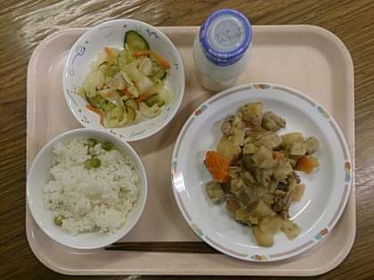 今日の給食は、「グリーンピースごはん」「五目うま煮」「野菜の梅ドレッシングかけ」「牛乳」です。