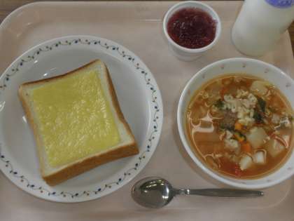 今日の給食は「チーズトースト」「ABCスープ」「あじさいゼリー」「牛乳」です。あじさいゼリーは6月を代表する花、あじさいをイメージして、2種類のゼリーを使って作りました。季節感を感じられるメニューです。