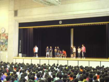 クイズや寸劇を交えて、楽しく、分かりやすく水泳学習の心得について紹介してくれました。いよいよ来週から水泳の学習が始まります。