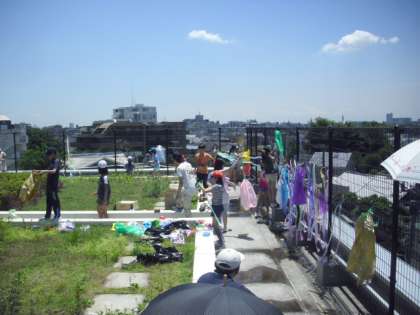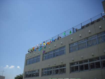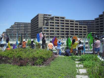 子どもたちは様々な素材を使い仕上げた作品を、屋上フェンスにつけていきました。