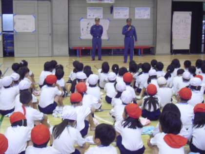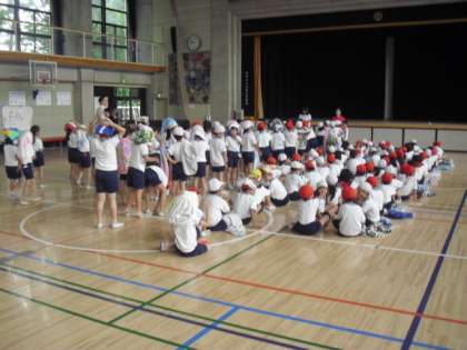 2年生は「水泳の時に地震が起きたらどのように行動するかを考える授業」を行っております。今日は消防署の方をお招きして、実際に避難するところを見ていただきました。その後、消防署の方から、安全に避難する方法について教えていただきました。