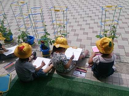 1年生は生活科であさがおを育てています。毎日自分でお世話をして随分大きくなりました。今日は自分のあさがおの観察です。もっと大きく育って素敵なお花を咲かせるのが楽しみです。