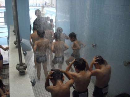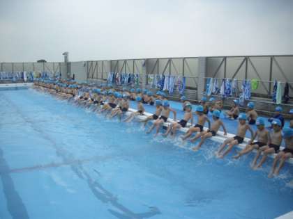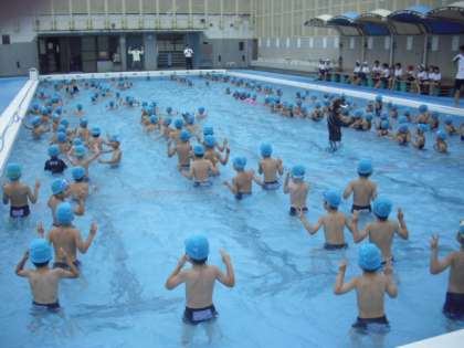 準備運動をして、いよいよシャワーです。子どもたちは冷たいシャワーに入る時も、声を出さずに静かにしようと頑張っていました。その後はプールの入り方の確認です。担任の笛の合図でゆっくりゆっくりプールの中に入りました。入った後は、音楽に合わせて水中ダンスです。みんな楽しそうに踊っていました。