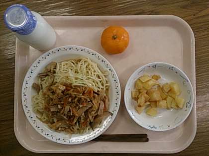 今日の給食は、「冷やし中華」「ジャガイモのから揚げ」「冷凍みかん」「牛乳」です。