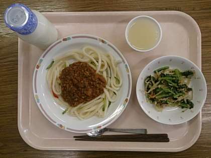 今日の給食は、「冷やし肉みそうどん」「野菜のごまだれかけ」「リンゴゼリー」「牛乳」です。