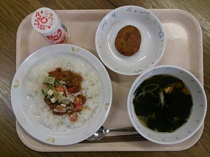 今日の給食は、「タコライス」「すまし汁」「あんだーもち」「ジョア」です。