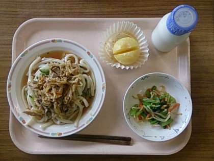 今日の給食は、「五目冷やしうどん」「ジャガイモのバター焼き」「おひたし」「牛乳」です。