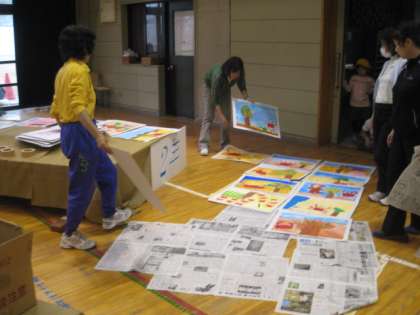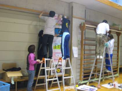 今週の金曜日、土曜日、学習発表会があります。図工や家庭科の授業で作った作品が展示されます。先生たちは、子どもたちの作品をどのように展示すればよいか、考えながら準備をしています。遅くまでがんばってやっています。