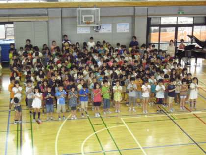今日の音楽朝会は「にじ」を合唱しました。はじめに6年生がリコーダーで伴奏を吹き、最後のサビの部分では4年生がリコーダーでリズムをとりました。
