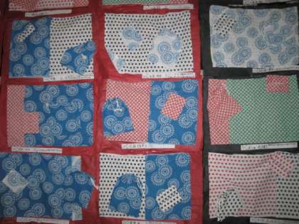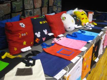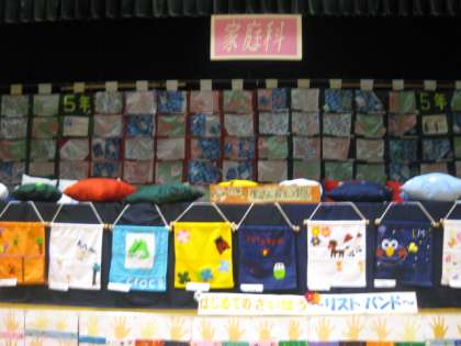 5年生は、「手拭いを使って」です。日本手拭いを使って、ランチョンマット、巾着袋、ティシュケースを作りました。2種類の手ぬぐいをそれぞれ個性的に使って作っています。6年生は、「生活に役立つ物」です。生活に役立つすぐに使える物を作りました。それぞれ個性的です。