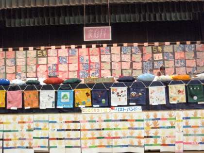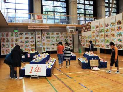 学習発表会をきょう・あすの2日間にわたって実施しています。今年度は、展示発表の年になっており、1〜6年生までの図工作品と5・6年の家庭科作品が体育館に飾ってあります。総数2000点をこえる作品は、なかなか壮観な眺めにもなっています。