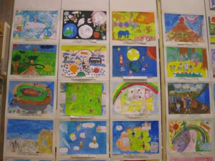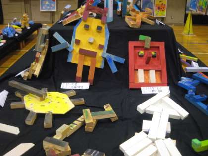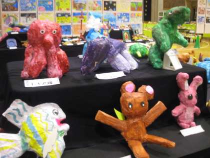 平面作品は、「気がつくとそこにいた、ひみつの話」です。夢の中で不思議な世界に迷い込みました。自分は、どんな所で何をしているでしょう。想像の世界を楽しんで描いています。立体作品は、「張り子の生き物」と「ワクワクフレーム」です。張り子は、昔から伝わる技法です。楽しい動物ができています。展示の工夫も見ものです。ワクワクフレームは、長い棒とベニヤ板使って作ってあります。自分の好きな形を考えています。