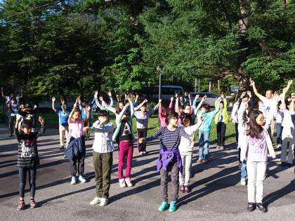 ひんやりした清々しい空気。雲一つない青空。気持ちのいい朝です。ラジオ体操第一で眠気を吹き飛ばしました。