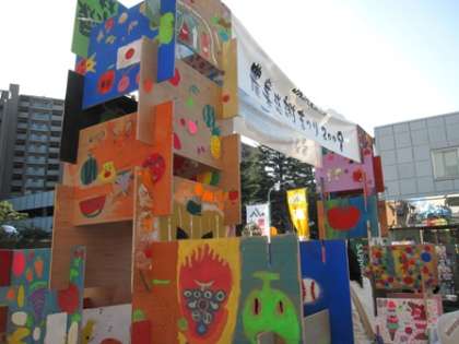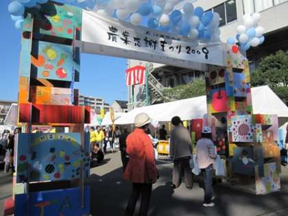 15日(日)、JA東京中央で、「農業感謝まつり2009」が開かれました。参加された方もいると思います。会場の入口の入場門は、塚戸小学校の子どもたちが制作したものです。図工専科教諭の横田先生の図工の時間、自分の作品の制作が終わった子どもたちに少しずつ作らせていました。それをJAの方で、組み立てました。ご覧ください。