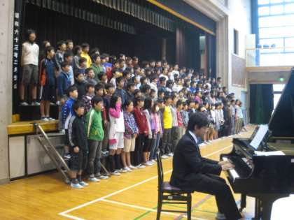 朝の音楽集会では、「夢の世界」を歌いました。まず、6年生が6年担任の石橋先生の伴奏のもと、二部合唱で歌ってくれました。さすが6年生です。上手いです。全校で歌って、気持いい朝の歌声でした。みんな元気がでました。