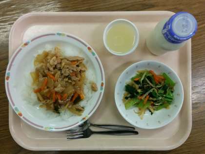 今日の給食は、「スタミナ丼」「ナムル」「リンゴゼリー」「牛乳」です。