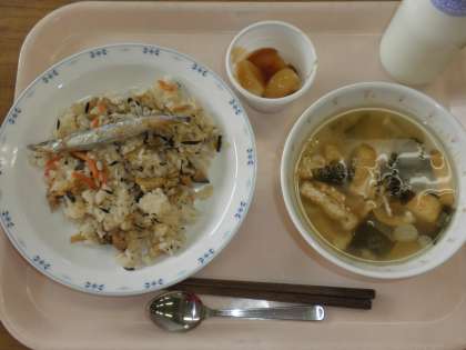 今日は十五夜です。メニューは十五夜にちなんで「ひじきごはん」「焼きししゃも」「えのきのみそ汁」「月見団子」「牛乳」です。十五夜は月に見立てた丸いものなどをお供えして、月を鑑賞する日です。今日はあいにくの曇り空ですが、おうちでお団子を作るなど雰囲気だけでも楽しんでみてください。