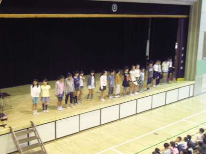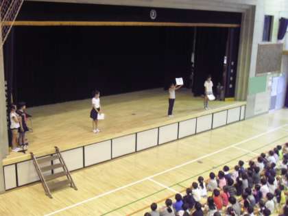 今日の児童集会は、美化委員会とエコ委員会の紹介集会です。まずは美化委員会が正しい掃除の仕方についてクイズ形式で発表をしました。