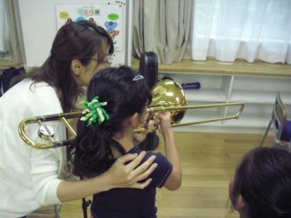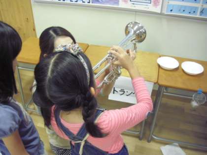 金管楽器の音を聴いた子どもたちは、自分も早く吹いてみたいと興味関心を高め、実際に音が出せたときには、笑顔を見せながら嬉しそうにしていました。