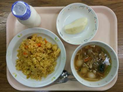 今日の給食は、「ツナピラフ」「春雨スープ」「りんご」「牛乳」です。