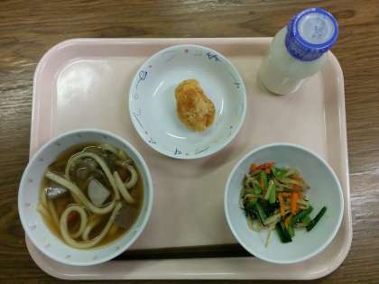 今日の給食は、お彼岸にちなんで「けんちんうどん」「野菜のごま和え」「おはぎ」「牛乳」です。