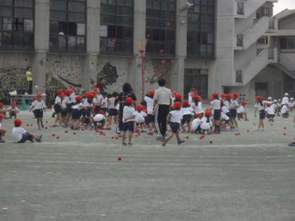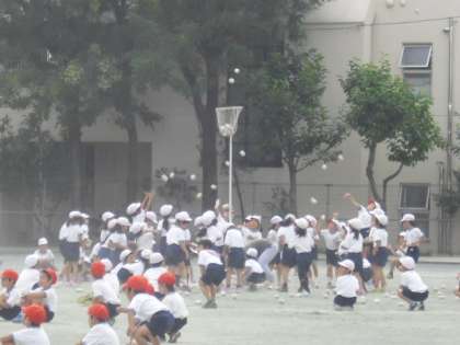 1年生の団体競技といえば、「玉入れ」です。今日はその練習を行いました。はじめは1年生らしいかわいいダンスです。子どもたちが大好きな曲にあわせて、楽しくダンスします。その後、男女別に玉入れをしました。