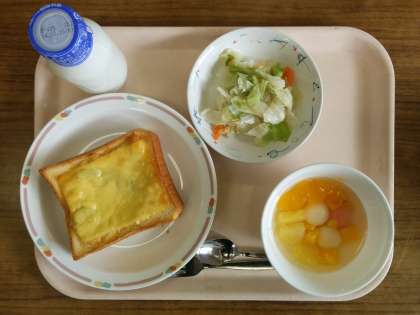 今日の給食は、「ツナチーズトースト」「キャベツサラダ」「紅白白玉ポンチ」「牛乳」です。運動会にちなんで赤と白の白玉を使いました。