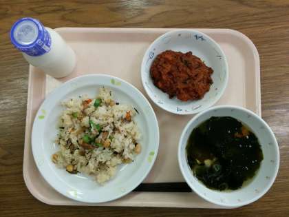 今日の給食は、「豆入りひじきごはん」「手作りさつま揚げ」「すまし汁」「牛乳」です。