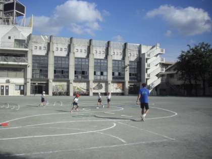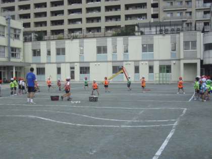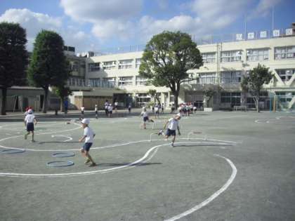 工夫された場や用具を使いながら、楽しく走・跳の運動に取り組んでいました。