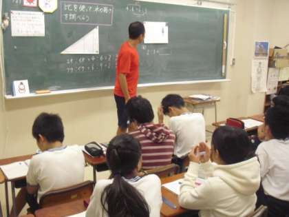 木から伸びる影の長さをもとに、木の高さを求める方法について自分の考えを発表した後、実際に校庭へ出て木の高さを測りに行きました。実際に行ったことによって、比の活用によって様々なことが分かることを実感していました。