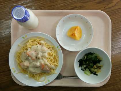 今日の給食は、「スパゲティクリームソース」「海藻サラダ」「柿」「牛乳」です。今日のサラダには「わかめ・昆布・茎わかめ・赤とさかのり・白とさかのり」の5種類の海藻が入っています。