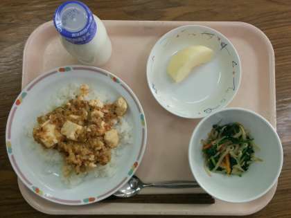 今日の給食は、「マーボー豆腐丼」「塩ナムル」「りんご」「牛乳」です。りんごは今が旬の果物で、お腹の調子を整えたり、虫歯の予防をしてくれる働きがあります。
