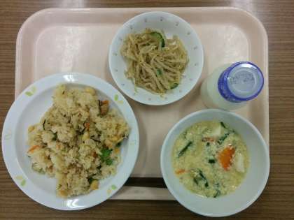 今日の給食は、「鶏飯風めかぶごはん」「にらたまスープ」「ゴマ酢かけ」「牛乳」です。