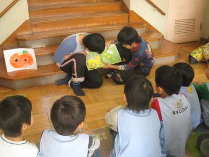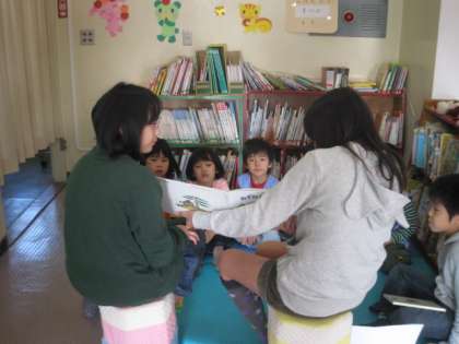 今日の交流は、5年4組でした。幼稚園の年長さんにとっては、3回目ですが、4組の子どもたちにとっては、初めてです。園児は3回目となると慣れてきます。5年生の読み聞かせを楽しみに待っています。