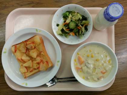 今日の給食は、「アップルトースト」「コーンシチュー」「わかめサラダ」「牛乳」で。今が旬のりんごを使ってトーストにしました。りんごの香りや甘みのわかるトーストです。