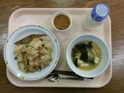 今日の給食は、「きのこごはん」「シシャモのから揚げ」「みそ汁」「黒蜜寒天」「牛乳」です。黒蜜寒天に使われている黒蜜は、砂糖のもとになるサトウキビのしぼり汁をにつめたものです。