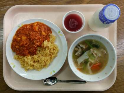 今日の給食は、「チリビーンズごはん」「ワンタンスープ」「ぶどうゼリー」「牛乳」です。今日から3日間給食に様々な種類の豆がでてきます。今日の豆は「大豆」です。