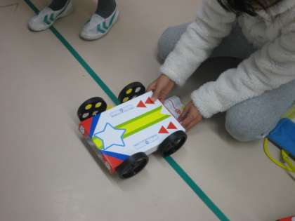 理科の授業でした。ゴムの働きを調べる実験でした。「ゴムで動く車を遠くまで走らせるためにはどうしたらよいでしょう」という課題です。ゴムの引っ張り具合を5cm,10cmの2通りを実験して確かめます。グループでとても仲良くやっているのが印象的でした。