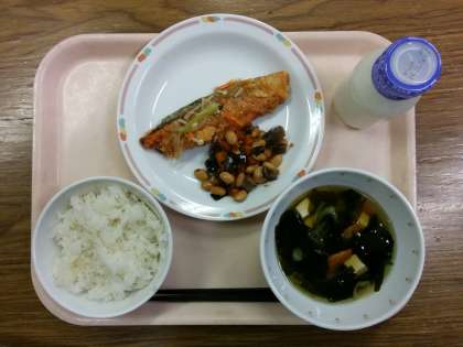 今日の給食は、「麦ごはん」「魚の竜田揚げ」「野菜のあんかけ」「五目豆」「すまし汁」「牛乳」です。竜田揚げとは、奈良県にある竜田川に流れるもみじをイメージとして作られた、秋が感じられる料理です。
