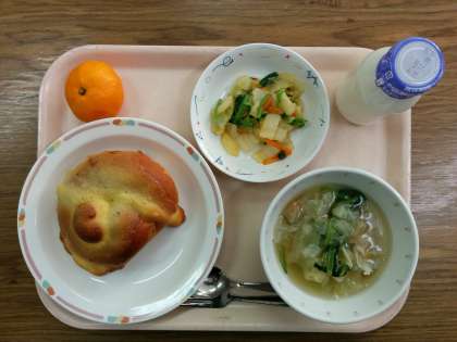 今日の給食は、「ビスキュイパン」「野菜スープ」「白菜のサラダ」「みかん」「牛乳」です。今回のビスキュイパンはいちごジャムではなくブルーベリージャムで作りました。