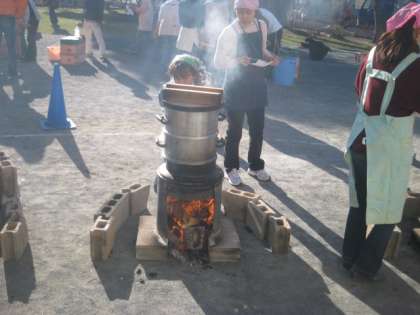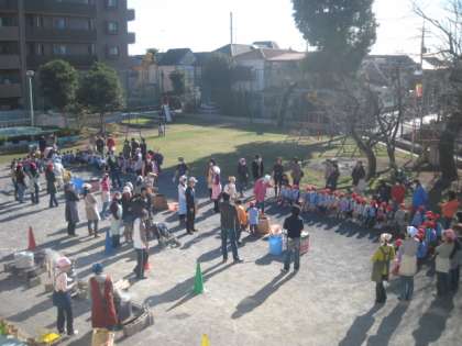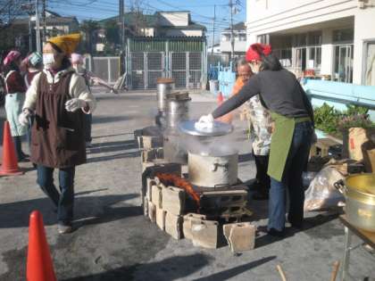冬晴れの下、幼稚園では、毎年恒例の「もちつき会」が開かれました。お父さんやお母さん、地域の人がお手伝いに来てくれました。おもちつきは、日本の伝統的な行事です。みんなで作り上げる楽しい行事でした。お手伝いありがとうございました。まず、火を燃やして、もち米を蒸す作業から始めます。