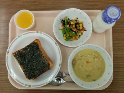 火曜日の給食は、「セサミトースト」「パンプキンシチュー」「ひじき入りサラダ」「フルーツゼリー」「牛乳」です。