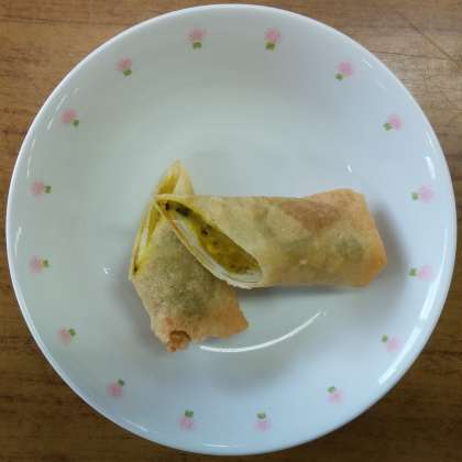 3.2を春巻きの皮で包み、巻き終わりの部分は分量外の小麦粉と水を合わせたもので しっかりとじる。