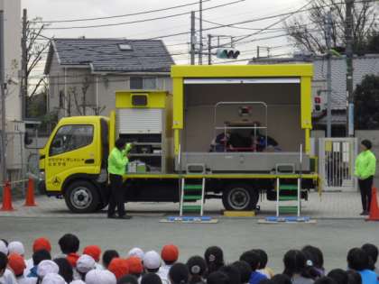 12月の避難訓練は「起震車」に乗り、地震が起きた際の正しい隠れ方について学びました。6年生が見本となって、地震が起きたらすぐに正座をして家具の脚をもって隠れるように教えてもらいました。