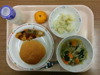 今日の給食は、「セルフフィッシュサンド」「パセリポテト」「ベーコンと白菜のスープ」「みかん」「牛乳」です。