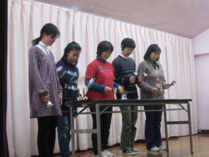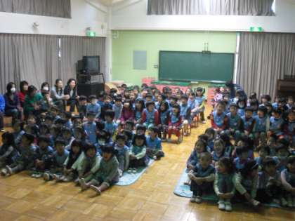 お楽しみ会をしました。先生たちが、ハンドベルでクリスマスの曲を演奏してくれました。「あわてんぼうのサンタクロース」の歌を歌っていると・・・・・・・。どこからか鈴の音が聞こえてきました。