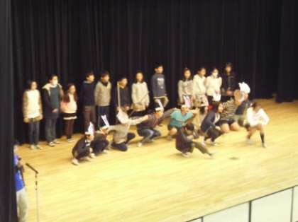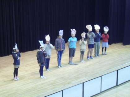 まずは学校で飼っているウサギの紹介をしました。次に飼育委員会の一週間を替え歌にあわせて発表しました。替え歌とダンスがとても楽しく子どもたちからは笑顔が絶えませんでした。